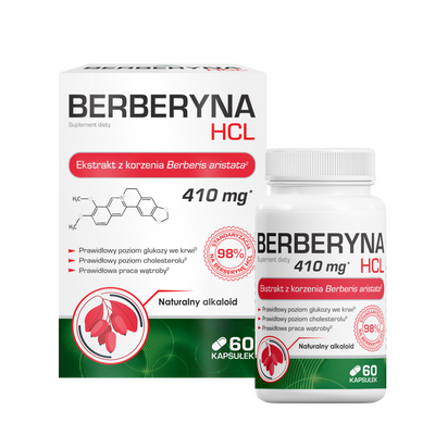 Berberyna HCL to suplement diety zawierający wysoko skoncentrowany ekstrakt z korzenia Berberis aristata, standaryzowany na 98% berberyny HCL. Jest to naturalny alkaloid roślinny znany ze swojego korzystnego wpływu na metabolizm glukozy, poziom cholesterolu oraz funkcjonowanie wątroby.