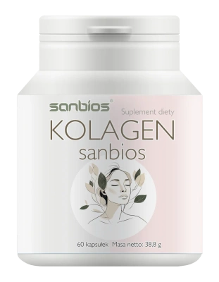 - Kolagen SANBIOS to produkt zawierający w składzie dobrze przyswajalny kolagen – rybi, kwas hialuronowy i witaminy C, A i E.