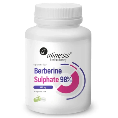 - Aliness Berberine Sulphate 99% 400 mg to suplement diety zamknięty w wegańskich kapsułkach, przeznaczony do spożycia przez osoby dorosłe.